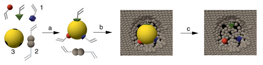 1: Functional monomers, 2: cross-linker, 3: template molecule; a: assembly of the pre-polymerisation complex, b: polymerisation, c: extraction of the template liberating the binding site